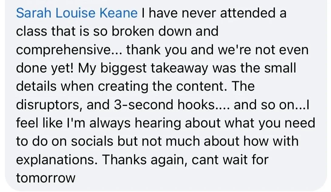 You’ll get bite-sized video lessons, how-to guides, and workbooks that show you exactly how to do the things everyone else makes look easy — from content ideas and filming angles to editing and repurposing videos.